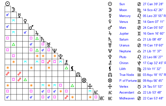 | Moon | 14 Scorpio 36 | 3 Gemini 54 | 16 Cancer 38 |