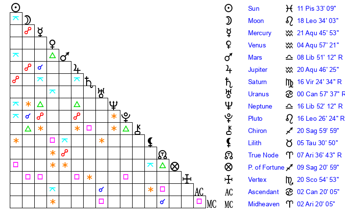 | Neptune | 16 Libra 51 | 28 Pisces 57 | 14 Libra 59 |