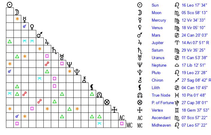 | Moon | 5 Scorpio 56 | 22 Aquarius 9 | 25 Cancer 23 |