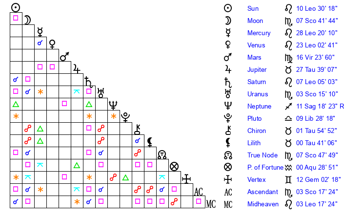 | Moon | 7 Scorpio 41 | 23 Scorpio 31 | 15 Leo 39 |