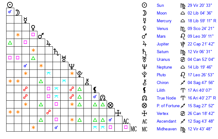 | Neptune | 14 Libra 20 | 0 Aries 46 | 16 Libra 51 |