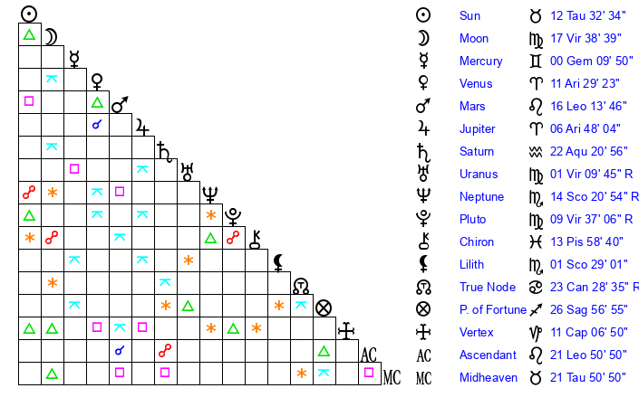 | Uranus | 1 Virgo 13 | 26 Taurus 29 | 2 Virgo 33 |