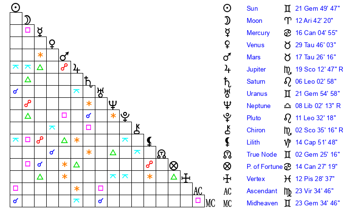 | Moon | 12 Aries 32 | 20 Capricorn 30 | 25 Aquarius 28 |