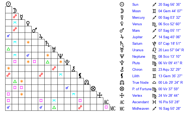 | Jupiter | 14 Sagittarius 34 | 23 Cancer 30 | 27 Sagittarius 57 |