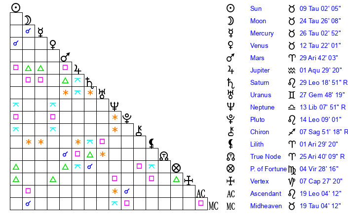 | Venus | 12 Taurus 22 | 29 Pisces 27 | 15 Leo 30 |