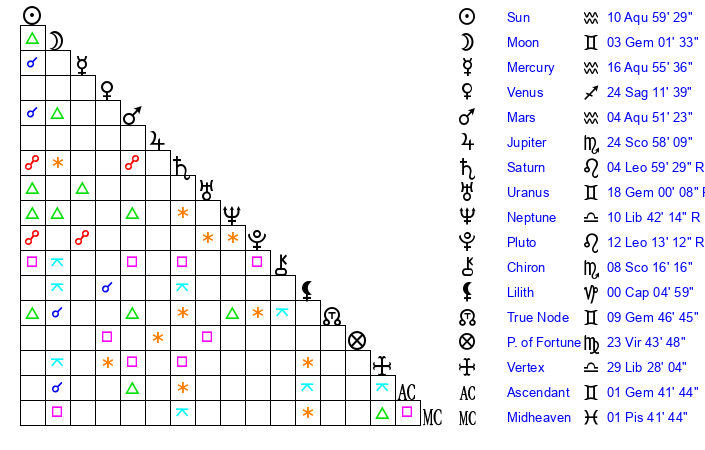 | Sun | 10 Aquarius 59 | 12 Aquarius 4 | 28 Aries 48 |