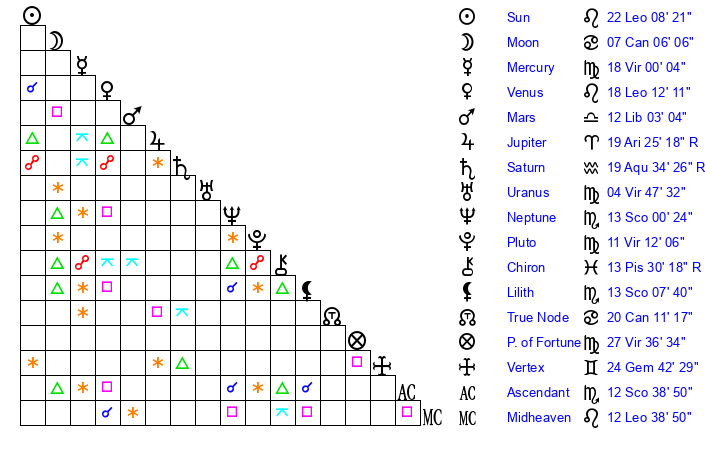| Venus | 18 Leo 13 | 18 Cancer 9 | 5 Scorpio 16 |