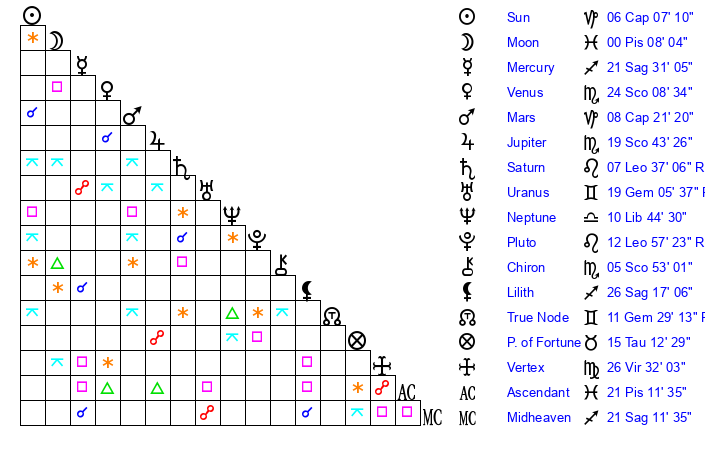 | Moon | 0 Pisces 10 | 7 Sagittarius 50 | 13 Capricorn 7 |