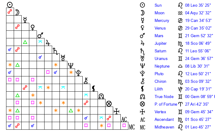 | Pluto | 12 Leo 50 | 2 Aquarius 24 | 14 Leo 45 |