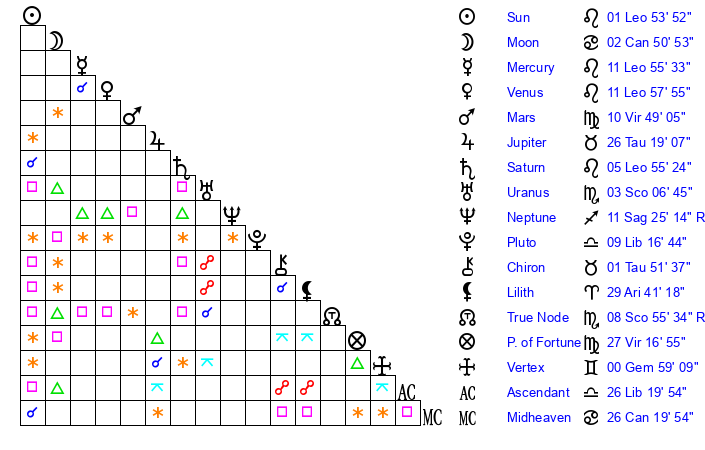 | Venus | 11 Leo 58 | 22 Gemini 34 | 12 Libra 15 |
