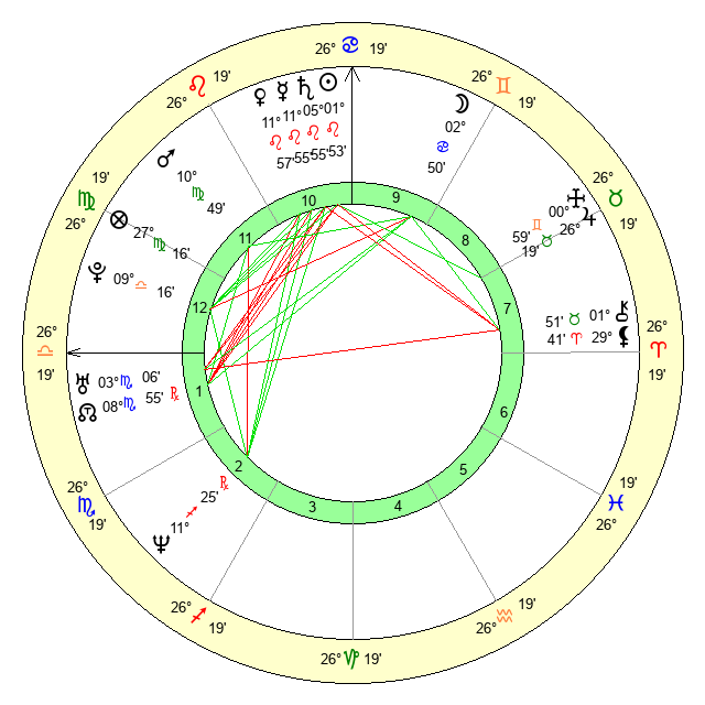 | Moon | 2 Cancer 50 | 0 Leo 46 | 24 Aries 19 |