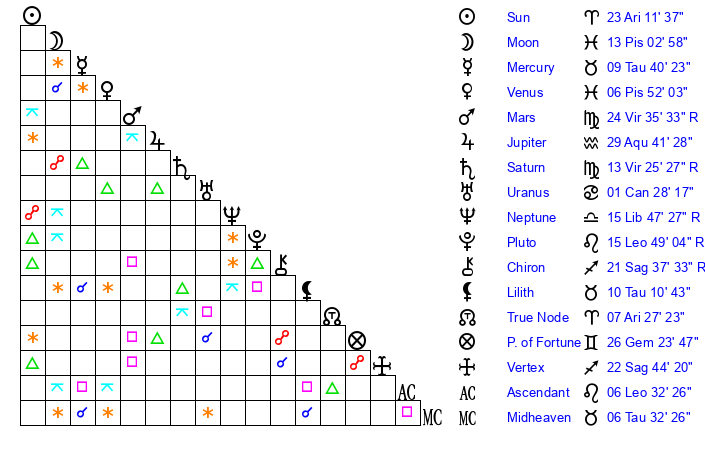 | Moon | 12 Pisces 56 | 1 Scorpio 27 | 6 Sagittarius 0 |