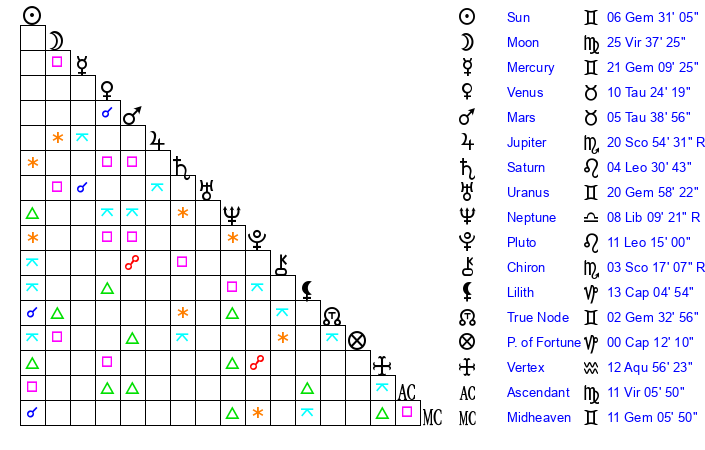 | Jupiter | 20 Scorpio 46 | 27 Gemini 16 | 18 Scorpio 53 |