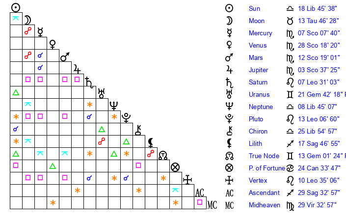 | Venus | 28 Scorpio 18 | 28 Virgo 32 | 25 Scorpio 36 |