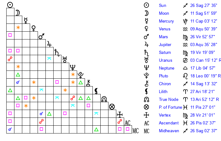 | Moon | 11 Sagittarius 59 | 12 Sagittarius 4 | 17 Virgo 7 |