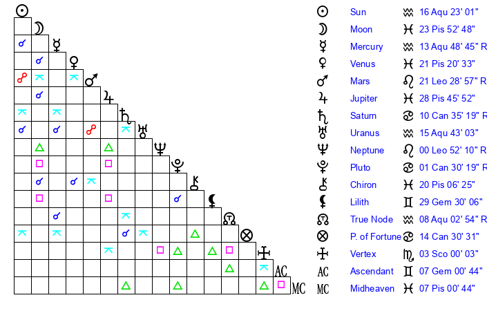Sun | 16 Aquarius 23 | 17 Aquarius 57 | 3 Gemini 55 |