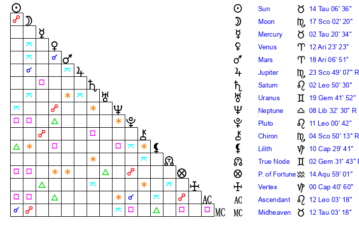 Sun | 14 Taurus 7 | 15 Taurus 12 | 28 Cancer 48 |