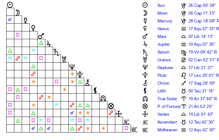 | Neptune | 17 Libra 21 | 27 Pisces 34 | 16 Libra 6 |