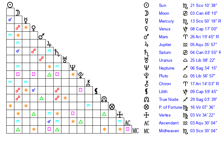 | Sun | 21 Scorpio 10 | 21 Scorpio 34 | 13 Capricorn 58 |