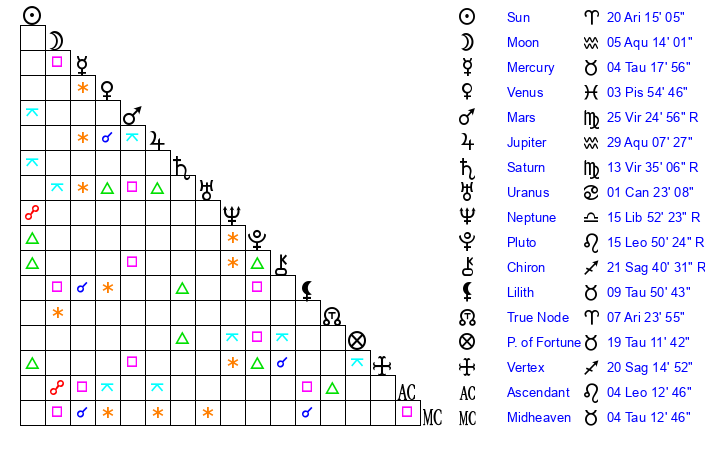 | Saturn | 14 Virgo 8 | 25 Pisces 33 | 14 Virgo 27 |