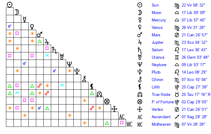 | Neptune | 9 Libra 53 | 0 Aries 56 | 12 Libra 30 |