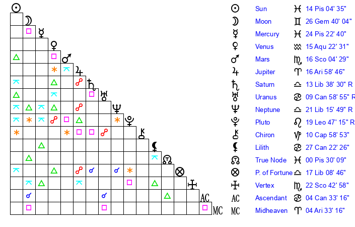 | Saturn | 14 Libra 12 | 21 Pisces 4 | 9 Libra 16 |