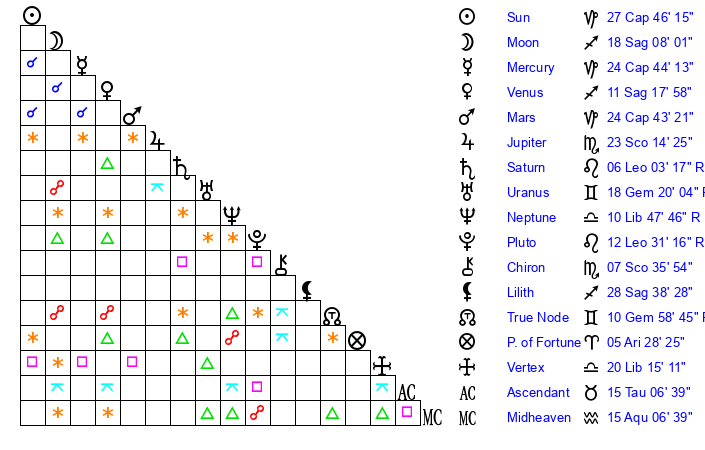 | Neptune | 10 Libra 48 | 27 Pisces 37 | 9 Libra 15 |