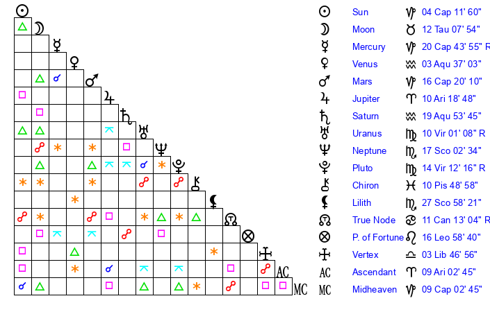 | Venus | 3 Aquarius 38 | 2 Capricorn 33 | 18 Aries 42 |