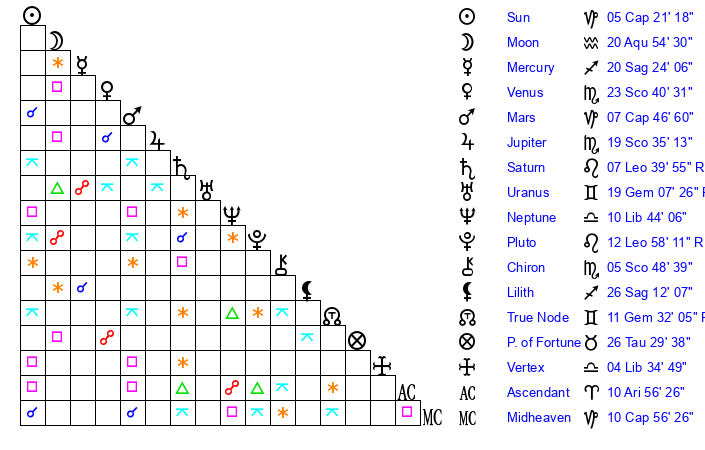 | Neptune | 10 Libra 44 | 27 Pisces 14 | 9 Libra 51 |