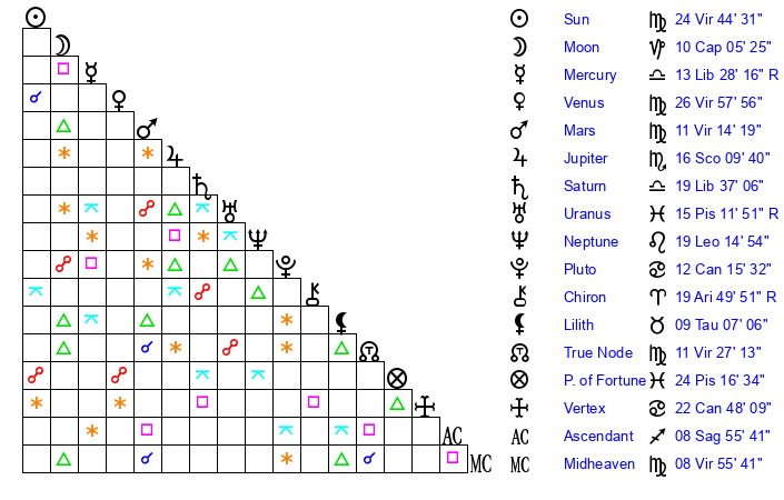 | Sun | 24 Virgo 45 | 26 Virgo 2 | 6 Capricorn 58 |