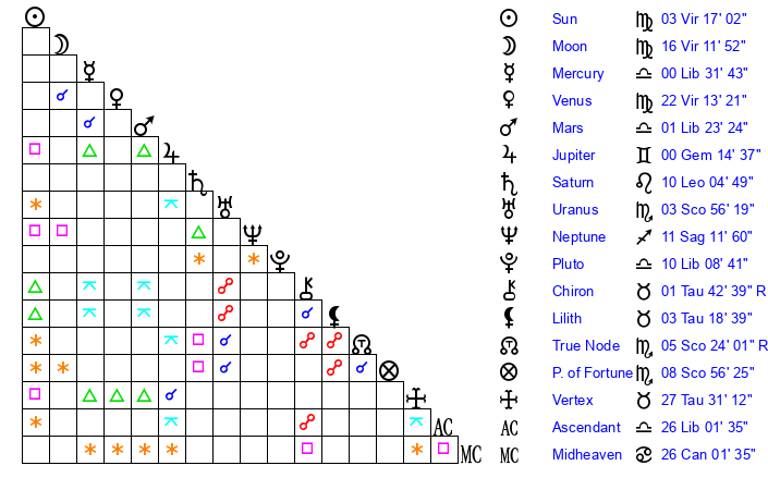 Sun | 3 Virgo 17 | 3 Virgo 26 | 21 Libra 11 |