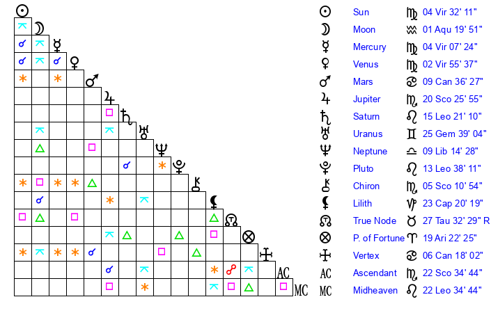 | Sun | 4 Virgo 32 | 5 Virgo 38 | 21 Scorpio 29 |