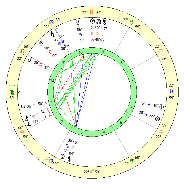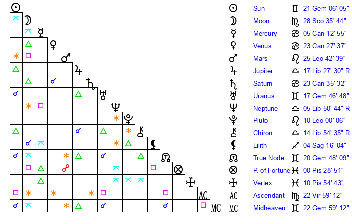 | Sun | 21 Gemini 6 | 21 Gemini 58 | 6 Virgo 42 |