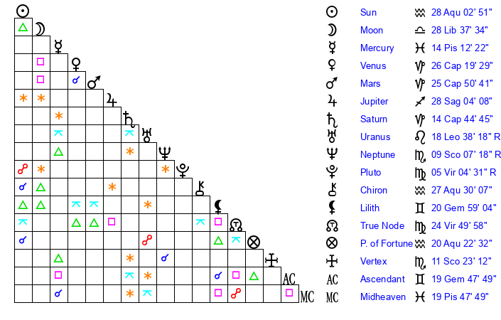 | Neptune | 9 Scorpio 6 | 28 Pisces 29 | 7 Scorpio 54 |