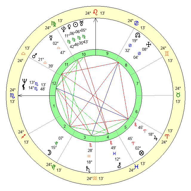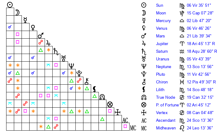 | Venus | 6 Virgo 47 | 6 Leo 0 | 23 Scorpio 58 |