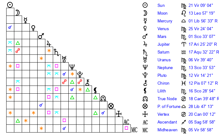 | Pluto | 12 Virgo 15 | 1 Aquarius 33 | 13 Virgo 58 |