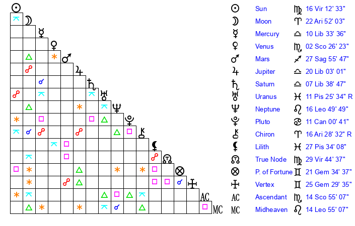 | Sun | 16 Virgo 13 | 17 Virgo 16 | 29 Sagittarius 4 |