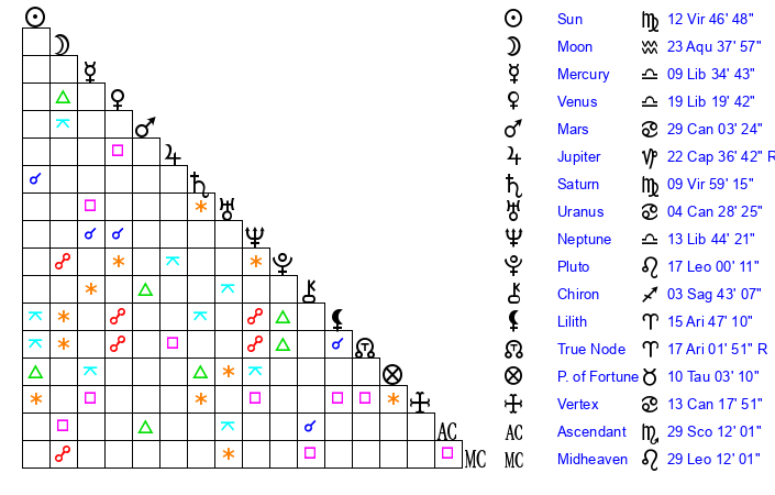 | Saturn | 10 Virgo 26 | 29 Pisces 34 | 18 Virgo 32 |