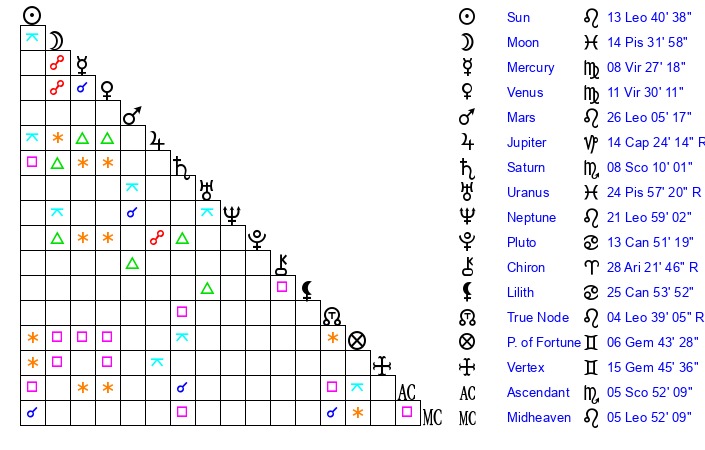 | Neptune | 21 Leo 59 | 1 Aries 53 | 24 Leo 44 |