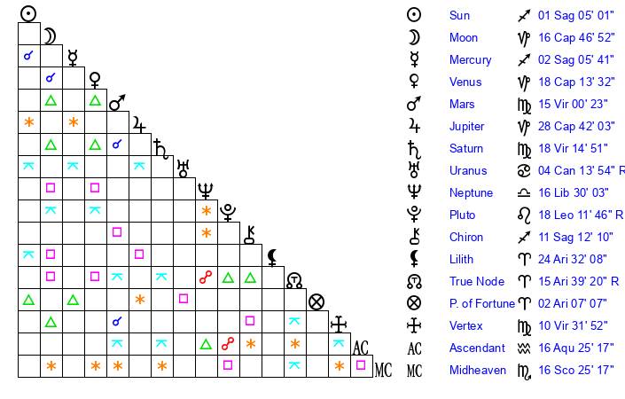 | Sun | 1 Sagittarius 5 | 1 Sagittarius 39 | 18 Aquarius 22 |