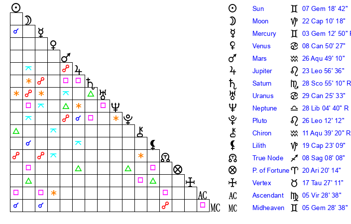 | Moon | 22 Capricorn 3 | 29 Gemini 42 | 2 Leo 15 |