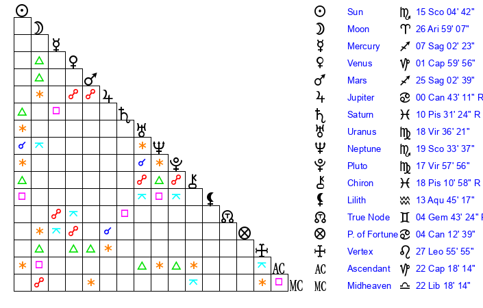 | Neptune | 19 Scorpio 34 | 27 Pisces 22 | 21 Scorpio 33 |