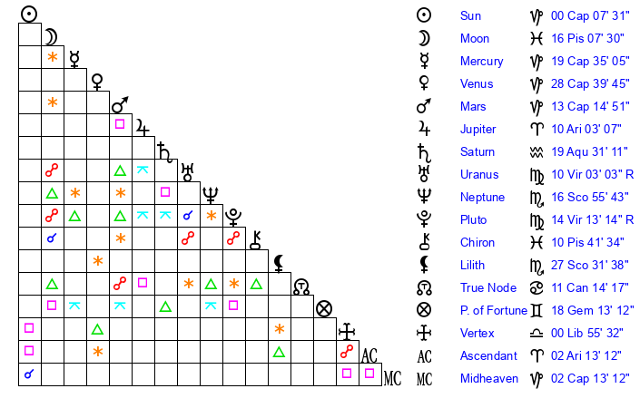 | Sun | 0 Capricorn 8 | 1 Capricorn 6 | 3 Pisces 7 |