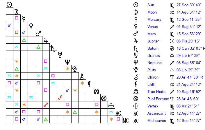 | Mercury | 12 Scorpio 11 | 27 Scorpio 52 | 2 Aquarius 56 |