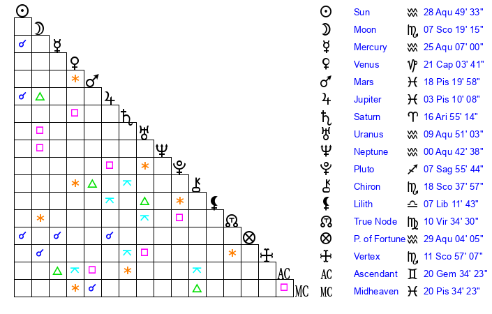 Sun | 28 Aquarius 50 | 29 Aquarius 17 | 25 Pisces 54 |