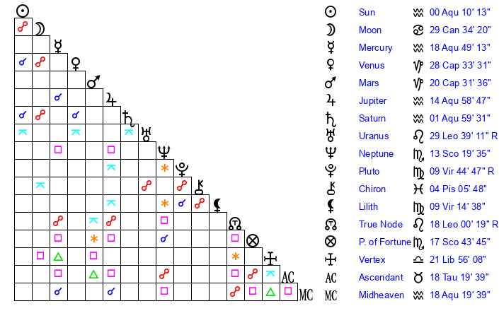| Mercury | 18 Aquarius 49 | 18 Capricorn 16 | 13 Pisces 53 |