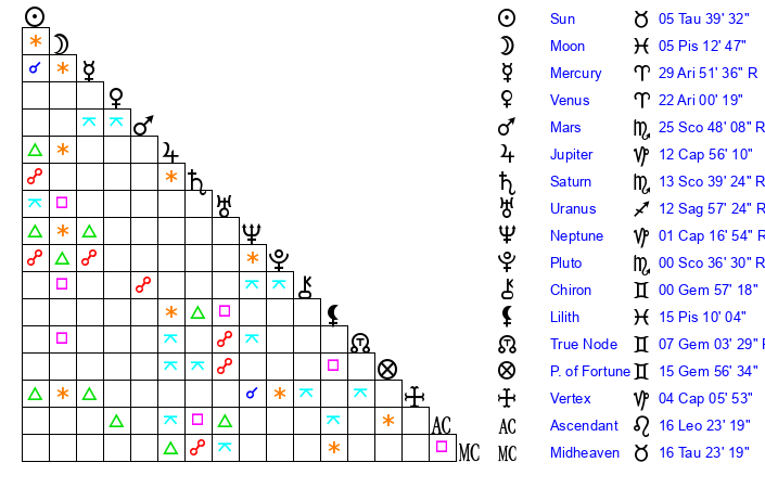 | Moon | 5 Pisces 6 | 6 Aries 0 | 2 Virgo 9 |