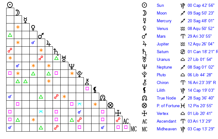 | Venus | 8 Aquarius 51 | 27 Sagittarius 31 | 25 Capricorn 49 |