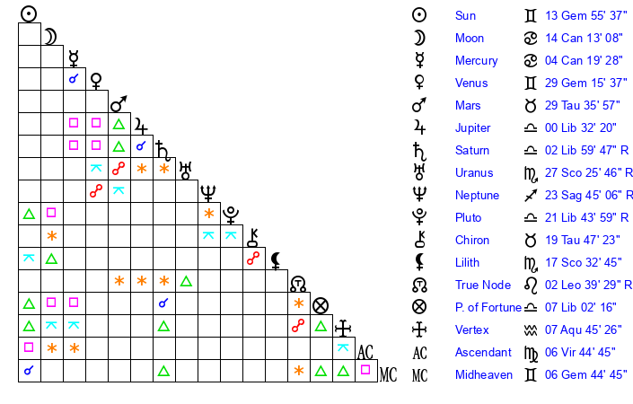| Moon | 14 Cancer 12 | 1 Libra 14 | 13 Aquarius 29 |