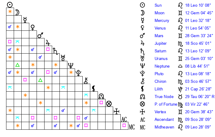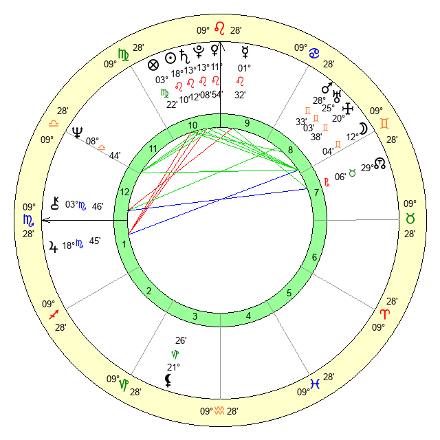 | Venus | 11 Leo 55 | 13 Cancer 27 | 18 Scorpio 53 |